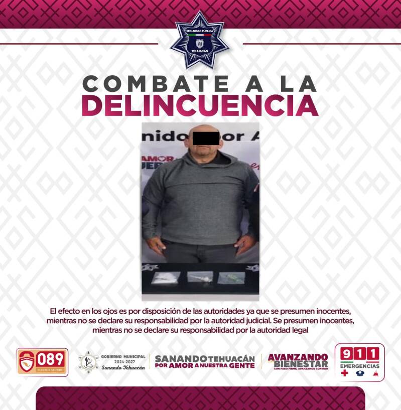 El masculino fue puesto a disposición de la Fiscalía General del Estado (FGE) por su presunta responsabilidad en el hecho con apariencia de delito consistente en delitos contra la salud, a fin de que se realicen las investigaciones correspondientes. Con estas acciones, el Gobierno de Tehuacán reafirma su compromiso de fortalecer de manera permanente la seguridad pública, a fin de proteger la integridad y tranquilidad de las familias tehuacaneras.