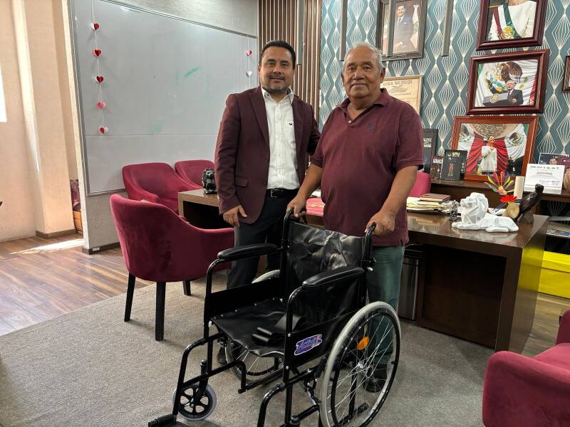 El presidente municipal de Tehuacán, Alejandro Barroso Chávez, realizó la entrega de una silla de ruedas en apoyo a María Olivia de 56 años, quien presenta una discapacidad motriz moderada derivada de una contusión.