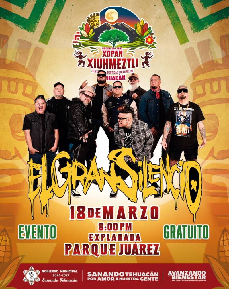 Este 18 de marzo a las 8:00 PM no te pierdas al grupo “El Gran Silencio” en la fiesta de Identidad Cultural ‘Xopan Xiuhmeztli’, celebrando la identidad cultural de Tehuacán.