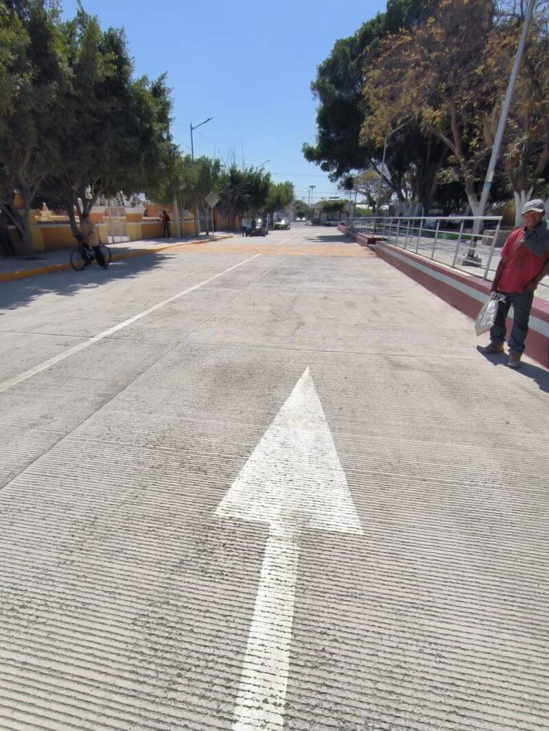 La obra incluyó concreto de 15 centímetros de espesor, construcción de guarniciones y banquetas, bolardos, pintura y señalética, además de la rehabilitación de accesos y colocación de barandal perimetral en el parque de la junta auxiliar.
